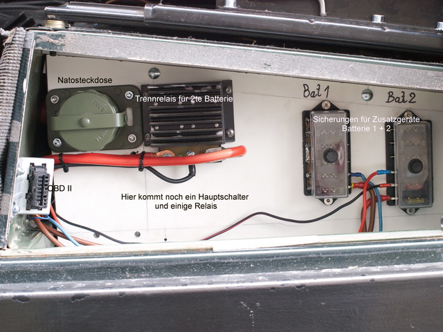 Für den Einsatz der Winde benötigen wir VIEL Strom (ca. bis zu 430 A). Dafür habe ich unter dem Fahrersitz eine kleine Schaltzentrale gebaut, mit Natodose, der Steuerung für die 2te Batterie und 2 Sicherungsbänke, jeweils eine für jede Batterie. Genug 50 qmm Einzelader und Kabelschuhe für die Winde hatte ich da. Die Steuerung der Winde kommt unter die Motorhaube, aus 2 Gründen: Da ist die Steuerung gut geschützt und wenn die Winde benutzt wird, muss die Motorhaube aufgemacht werden und die Windschutzscheibe ist geschützt, falls das Seil reisst. Eine Windenstossstange war schon länger angebaut. Also die Winde rein, festgeschraubt, sie passte perfekt und angeschlossen. Den Strom eingeschaltet und . . . . .Nichts passierte! Ahhh, die Fernbedienung musste noch angeschlossen werden und siehe da: DIE WINDE FUNKTIONIERTE !