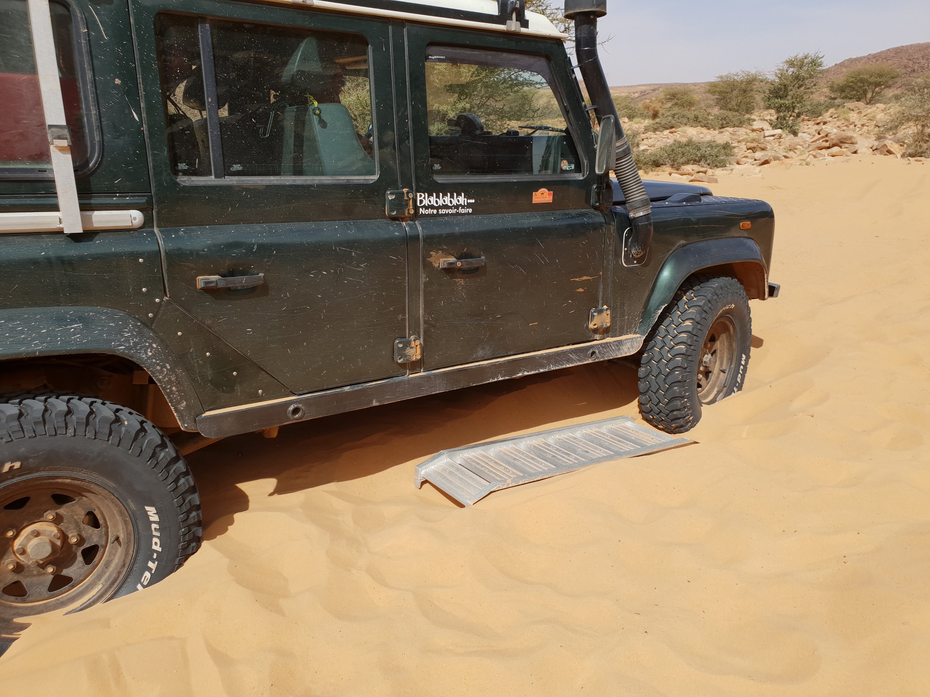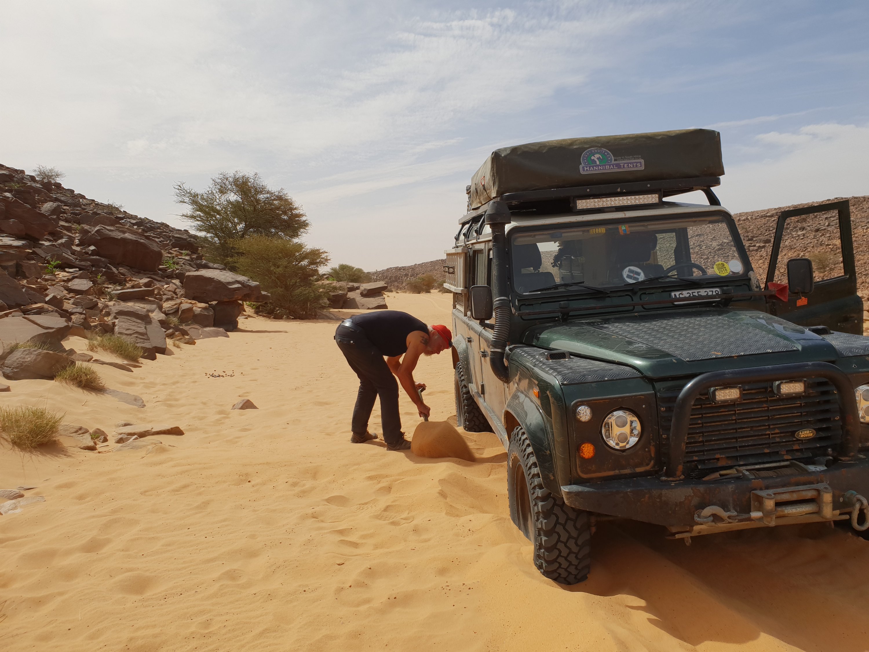 Von Ouadane fuhren wir Richtung Chinguetti. Richtung heisst: Wir haben einige Waypoints im GPS. Hin und wieder sieht man Fahrspuren im Sand. Ältere Spuren, frische Spuren. Der Anfang ist einfach: Dünen mit festen Sand. Wir flogen beinahe über die Dünen! Der Beifahrer navigiert: etwas mehr rechts oder links halten, oder dort hinten in den Bergen ist ein Einschnitt – dort fahren wir hin. Langsam verändern sich die Dünen, es gibt steinige Dünentäler, der Sand hat eine andere Farbstruktur, die Festigkeit des Sands variiert. Unbemerkt sind wir abseits der nicht vorhandenen Piste. Die Dünen sind grösser geworden und der Sand wird butterweich. Wir fahren uns ein. Mit Schaufeln und Sandblechen sind wir nach kurzer Zeit wieder auf sicheren Terrain – auf festeren Sand. Wir fahren schöne grosse Dünen hoch und steil wieder runter, bis es auf die Ebene zu den Bergen geht. Ebene? Nein, hier sind überall Sträucher – um die Sträucher sind Sandhügel. Fährt man hier zu schnell drüber, kann das Auto umgeschmissen werden. Wir zügeln das Tempo, finden eine Spur, viele Spuren. Fast alle führen in dieselbe Richtung, es geht zu dem Pass, über den Pass. Weicherer Sand kommt, wieder die tückischen Sträucher überall und dann ein breites Oued (Flussbett) ohne Wasser. Es ist Winter und es hatte entweder schon geregnet oder Wasser ist schon durchgeflossen. Das Flussbett ist feucht, aber gut befahrbar. Eine tolle Piste!