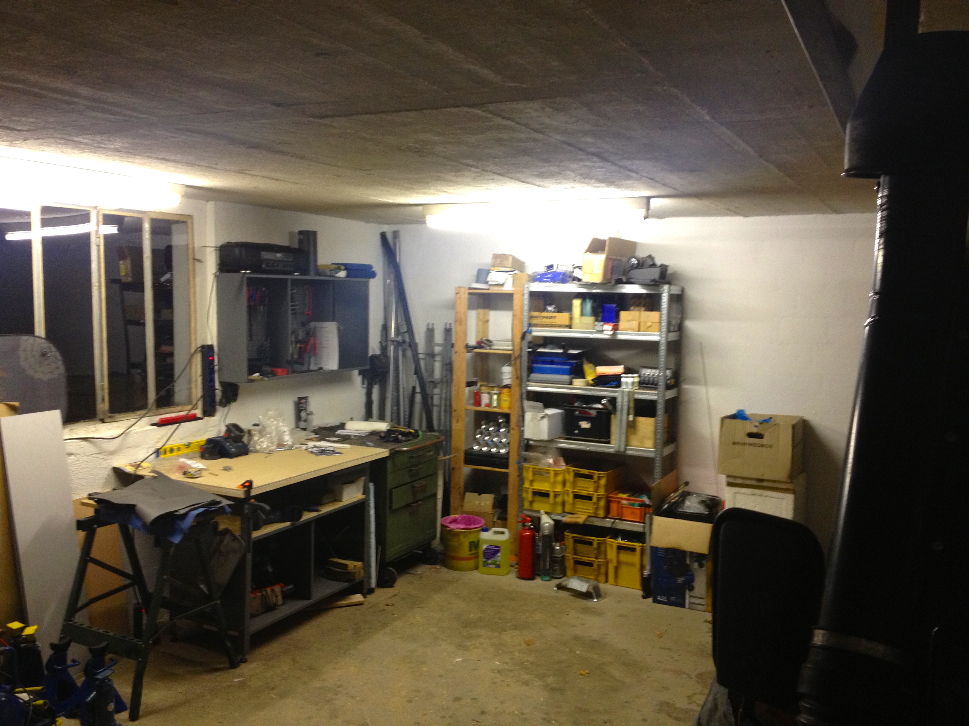 Die Werkstatt ist jetzt gut nutzbar, mit Werkbank, Regalen, div. Werkzeugen und einigem Material.