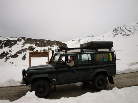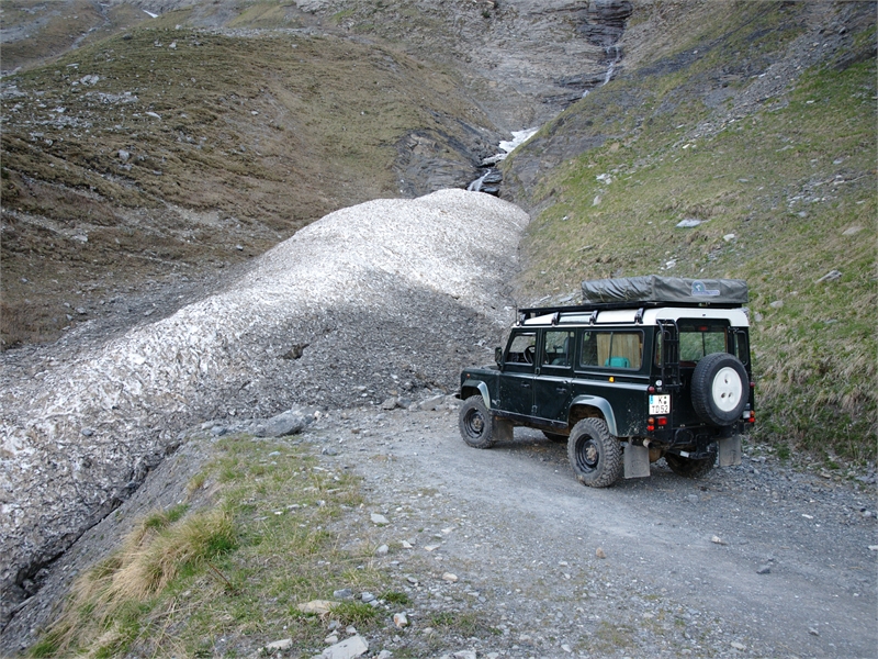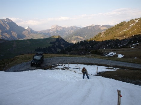Nach unserer kleinen Mittagspause ist der Spass vorbei – die Strasse ist noch nicht vollständig schneefrei. Der Weg durch auf Schnee und Matsch ist wie Schmierseife. Deswegen schippen wir abwechselnd eine Spur für den Dicken.